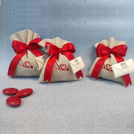 Sacchettino color juta, con ricamo personalizzabile. All'interno confetti.